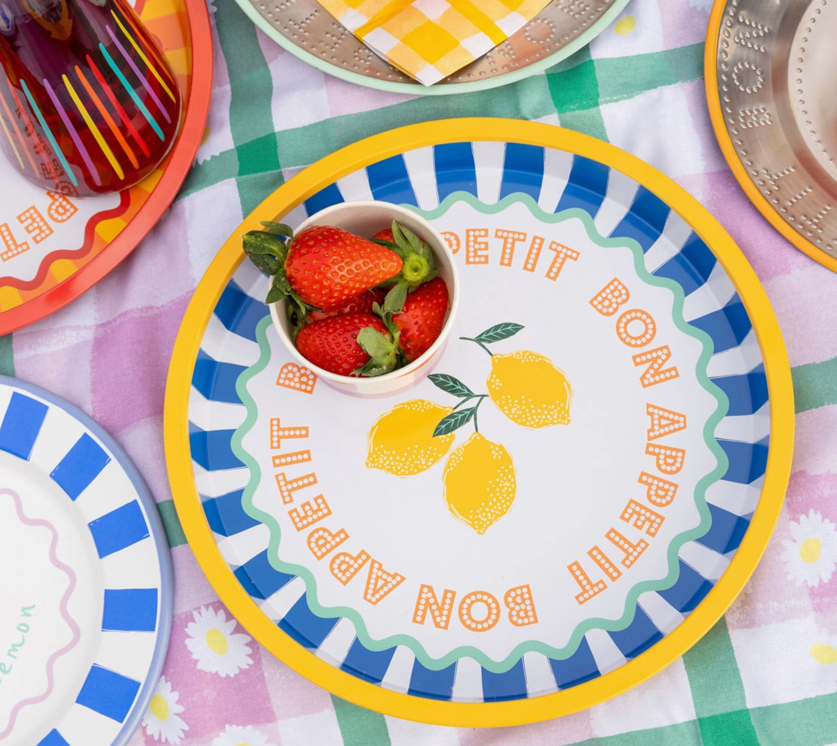 About this Bon Appetit Lemon Tin Tray - 31cm: Customers can holiday on the Mediterranean, but at home, with our Bon Appetit Tin Tray. Featuring a coastal inspired blue striped border and zesty lemon motif with circular text, it evokes the feeling of frolicking in the French Riviera without having to get on a plane. Size: 31cm Food Safe Hand Wash Only Product: Designed To last Packaging: Home Recyclable